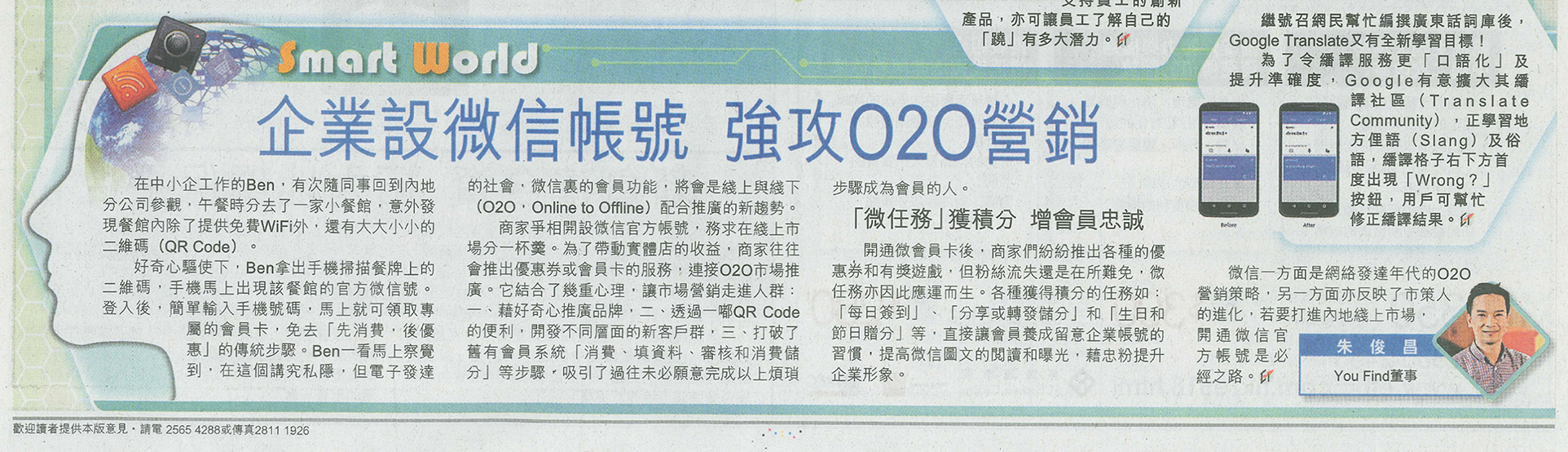 商家爭相開設微信官方帳號,務求在線上市場分一杯羹。為了帶動實體店的收益,商家往往會推出優惠券或會員卡的服務,鏈接O20市場推廣,它結合了機重心理,讓市場營銷走進人群:一,藉好奇心推廣品牌,二,透過一嘟QR Code的便利,開發不同層面的新客戶群,三,打破了舊有會員系統「消費、填資料、審核和消費儲分」等步驟,吸引了過往未必願意完成以上煩瑣步驟成為會員的人。