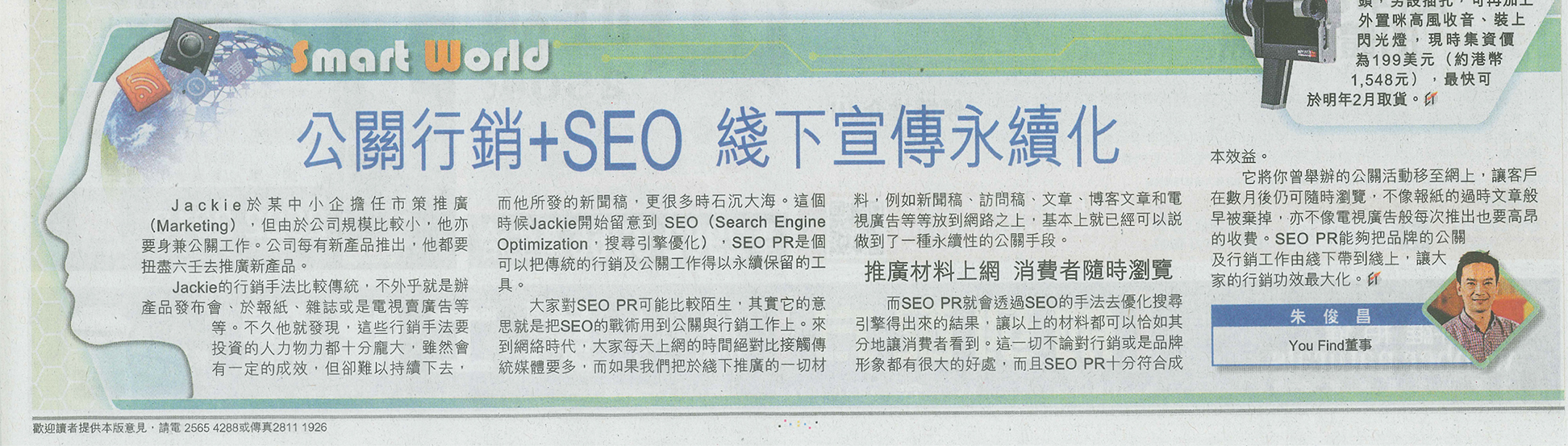 Jackie於某中小企擔任Marketing,但由於公司規模比較小,他亦要身兼公關工作。公司每有新產品推出,他都要扭盡六寅去推廣新產品。Jackie的行銷手法比較傳統,不外乎就是辦產品發布會、於報紙、雜誌或是電視賣廣告等等。但不久Jackie就發現這些行銷手要投資的人力物力都十分寵大,雖然會有一定的成效,但卻難以持續下去,而他所發的新聞稿,更很多時會石沉大海。這個時候Jackie開始留意到SEO PR,這個可以把傳統的行銷及公關工作得以永續保留的工具。
